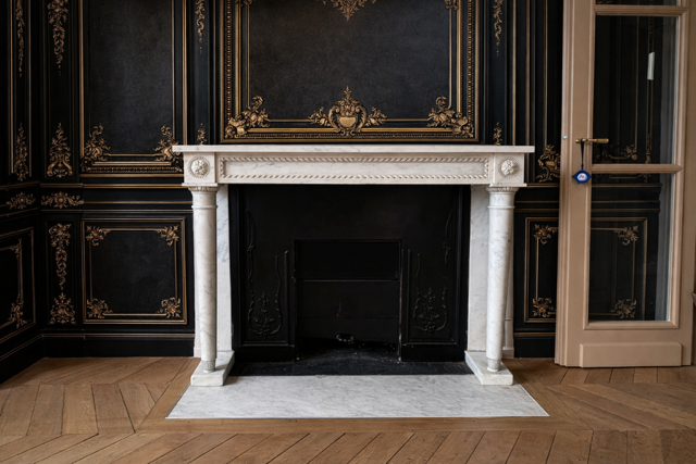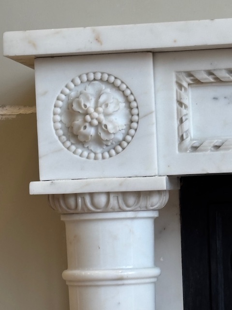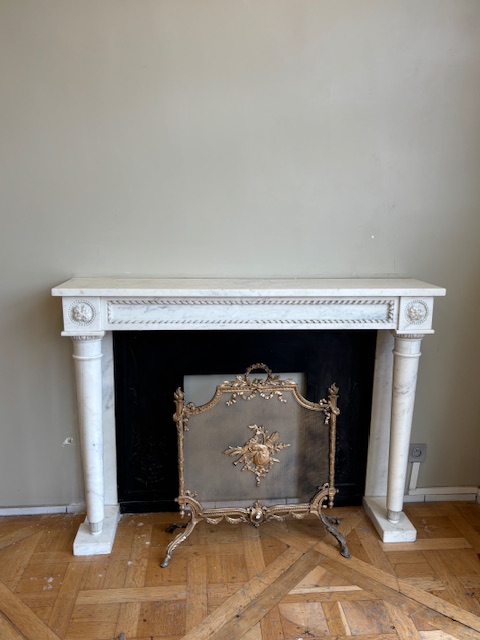 Belle cheminée ancienne de style Louis XVI réalisée en marbre blanc à décor de colonnes et rosaces datant de la fin du XIXème siècle