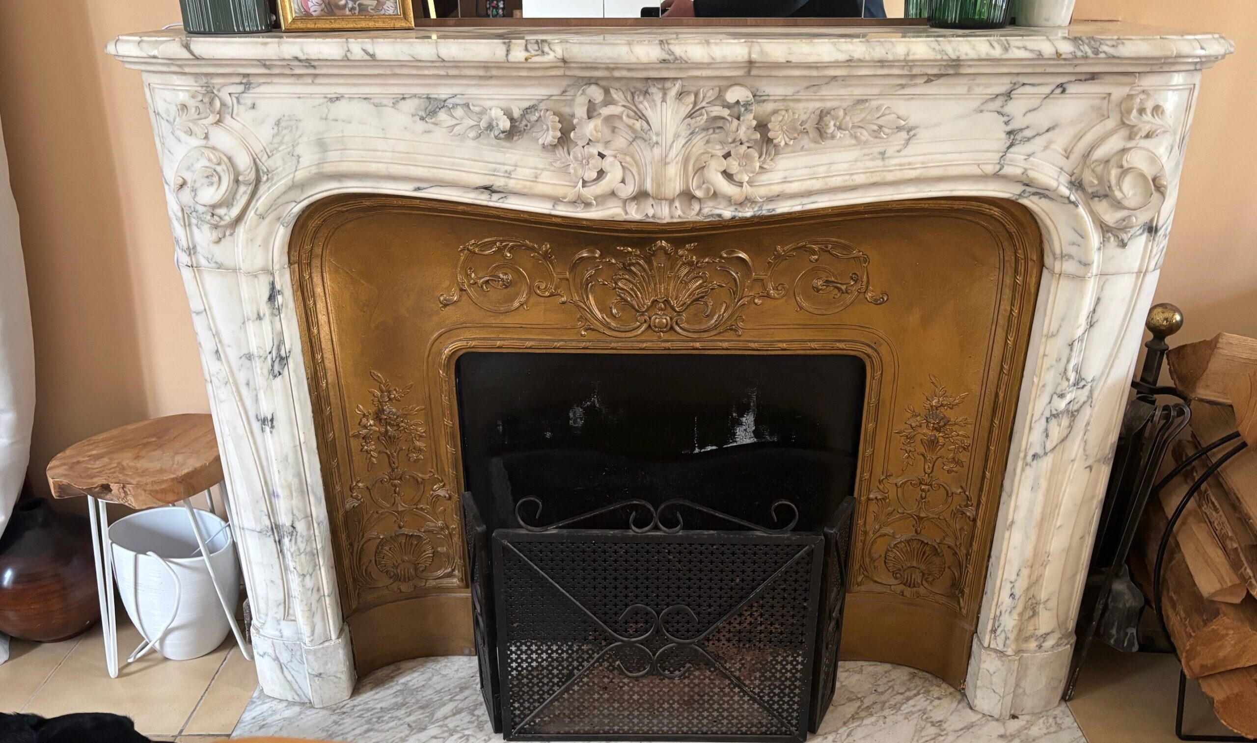 Belle cheminée ancienne de style Louis XV en marbre Arabescato datant de la fin du XIXème siècle , bandeau a voluptes à décors d’une élégante coquille sculptée et de jolies fleurs . Cette cheminée dispose de son rétréci en fonte d’origine son rideau et sa plaque foyere en marbre uni ,ses cotés sont panneautes .L ensemble est en bon état d’origine en cour de nettoyage et polissage dans nos ateliers prochainement disponible à notre show room .