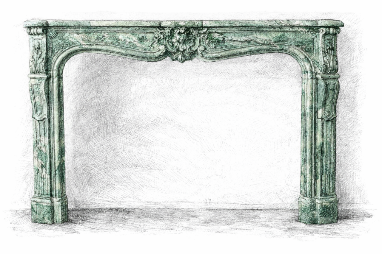 Belle cheminée ancienne Louis XV réalisée en marbre Vert De Mer sculptée d’une fine coquille au centre de son bandeau