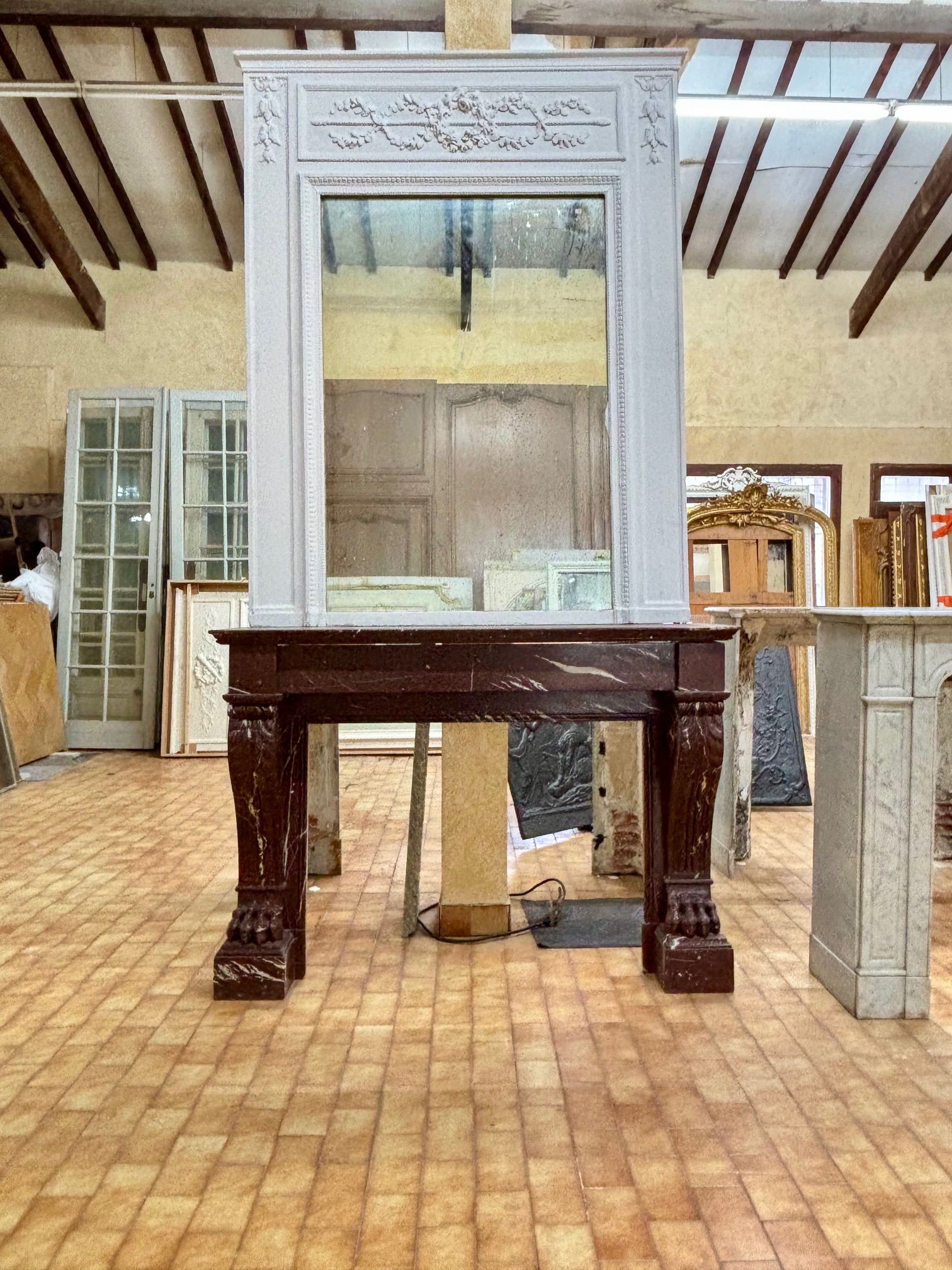 Belle et imposante cheminée ancienne de style Empire réalisée en marbre Rouge Griotte datant de la fin du XIXème siècle , ce modèle appelée a pattes de lions en référence au griffes sur les bas de ses grand jambages en forme de consoles . Elle dispose de son rideau d’origine ,un rétréci en aluminium moderne ainsi qu’une plaque foyere uni ou a cabochons seront fabriques sur mesure selon disponibilité du marbre . Entièrement restaurée dans nos ateliers disponible des a présent a notre showroom.