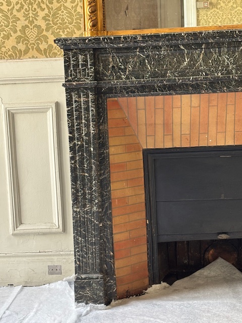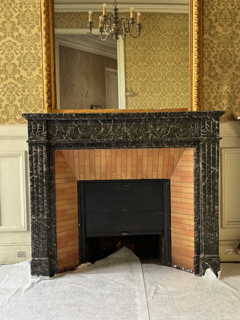 Cheminée ancienne de style Louis XVI réalisée en marbre Gris Saint Anne datant de la fin du XIXème siecle
