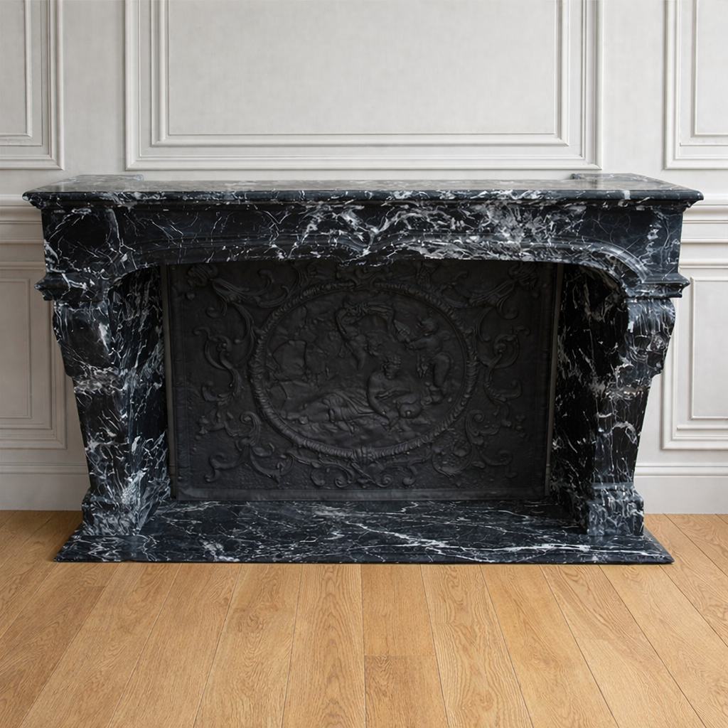 Rare et imposante cheminée ancienne en marbre grand Antique Noir d’époque Louis XIV