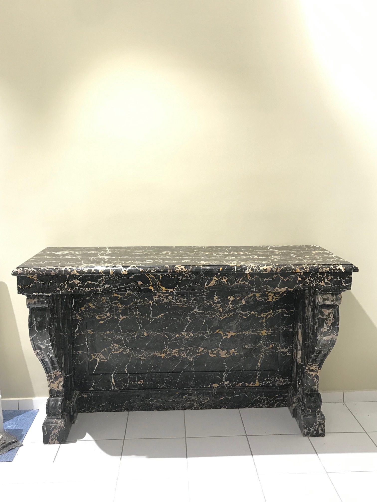 Magnifique et rare console en marbre Portor de style Empire datant de la fin du XIXème siècle avec ses pieds consoles à enroulements et son fond ,cette console est entièrement restaurée par nos marbrier en bon état . Disponible des a présent a notre show room.