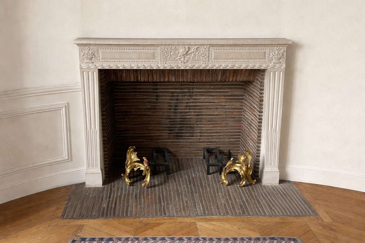 Élégante cheminée Louis XVI ancienne réalisée en pierre présentant un décor finement sculpté