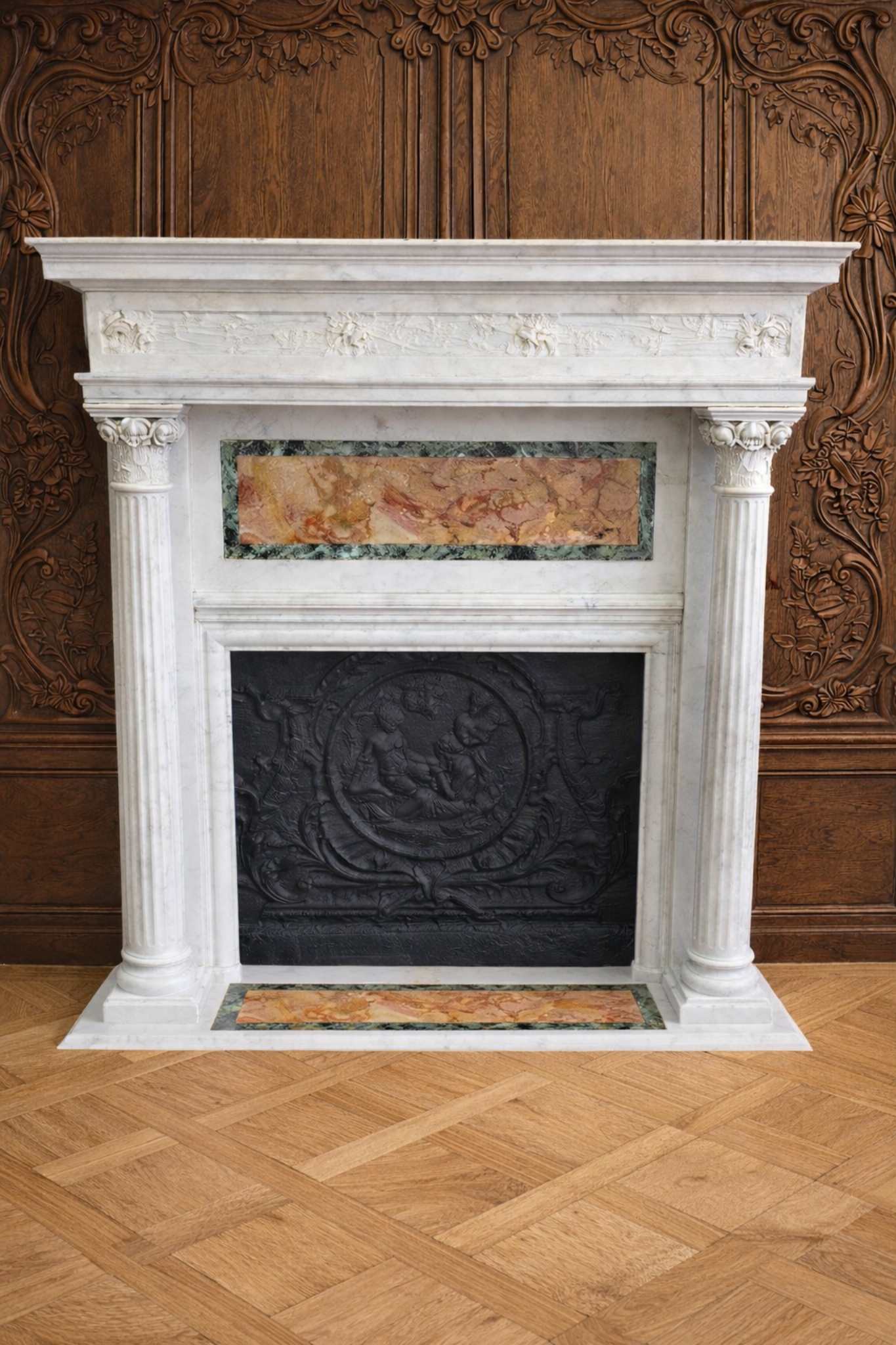 Rarissime cheminée Art nouveau realisee en marbre blanc carrare provenant d’un appartement parisien à décors de grandes colonnes détachées et chapiteaux sculptes , double bandeau l’un à décors de marqueterie de marbre brèche saint maximin et vert de mer l’autre à décors de fines sculptures représentant des fleurs dans le gout floréal , cheminée entièrement restaurée dans nos ateliers.