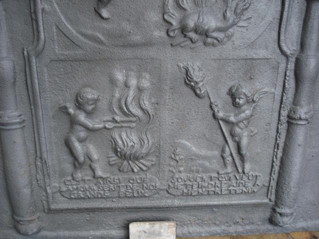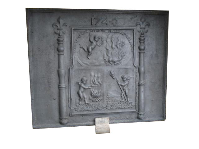 Cette plaque en fonte remarquable, présente une scène allégorique en relief. Surmontée de l’inscription de l’année de création, elle met en scène des putti (angelots) entourant un feu central, symbole puissant d’élévation et de purification.