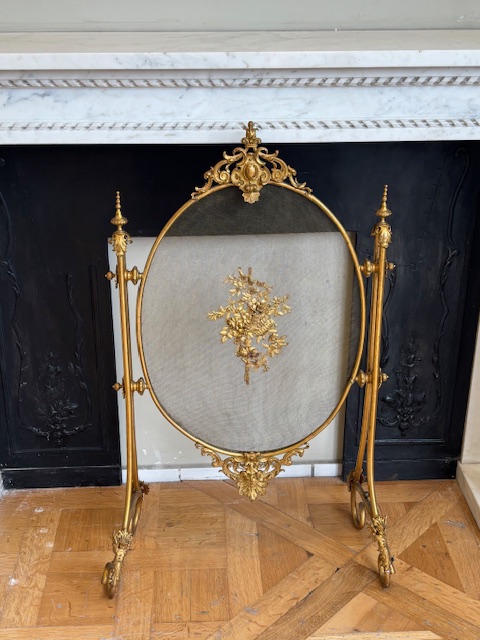 Rare et elégant Pare-feu ancien à écran ovale en toile métallique, orné en son centre d’un décor floral en bronze ciselé et doré.Encadrement richement sculpté de rinceaux, feuillages et motifs classiques, avec fronton ajouré et base ornée. Il repose sur quatre pieds galbés à roulettes, terminés par des sabots feuillagés Dorure d’origine présentant une belle patine, avec légères usures d’usage .Disponible des à présent à notre showroom.