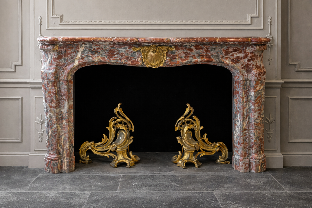 Rare paire de cheminée ancienne en marbre incarnat turquin Louis XV d’époque Napoléon III à décors de bronzes dores
