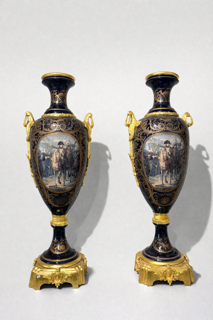 Importantes suite de deux vases identiques décoratifs en porcelaine dans le goût de la célèbre manufacture de Sèvres, réalisée au XXᵉ siècle. De forme balustre élancée, ces vases présentent un riche décor sur fond bleu profond rehaussé de rinceaux, motifs floraux et ornements finement dorés à l’or. La panse est ornée d’un cartouche central polychrome représentant une scène militaire inspirée de l’iconographie napoléonienne, figurant Napoléon Bonaparte à cheval entouré de ses officiers.
