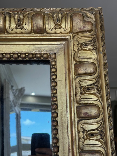 Tres Grand et rare miroir ancien de cheminée de style Louis XVI datant de la fin du XIXème siècle a decor de perles et godrons avec sa dorure a la feuille d’or et sa glace au mercure d’origine . En tres bon état disponible des à présent à notre showroom .