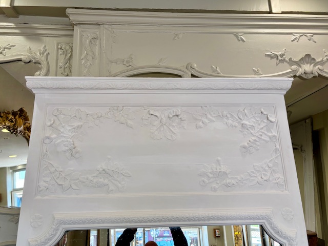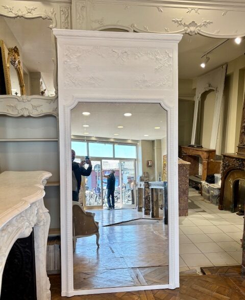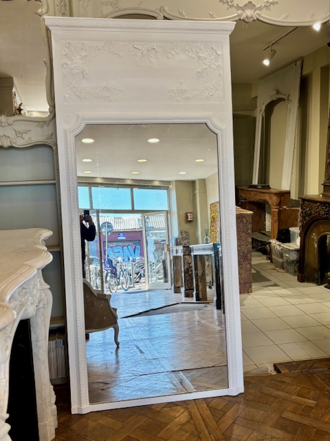 Tres grand Trumeau ancien peint en blanc de style Louis XVI datant de la fin du XIXème siècle . En bon état avec sa glace d’origine disponible des à présent à notre showroom .